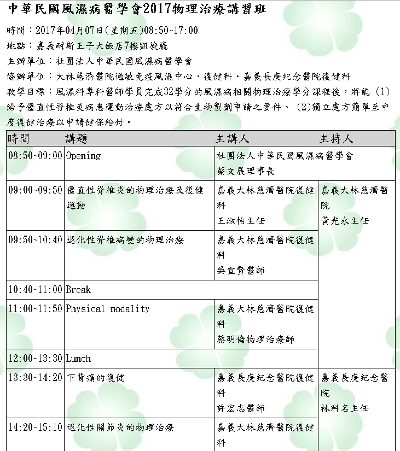 地點:國立臺灣大學 博雅教學館102教室(2017/03/12)、 高雄醫學大學 濟世大樓CS302教室(2017/04/30)、 中山醫學大學 正心樓0112教室(2017/06/04)
